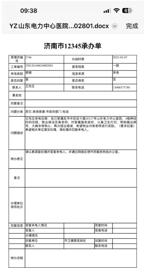 2025年1月27日,濟南連心物業(yè)有限公司駐山東電力中心醫(yī)院項目收到12345表揚電話,市民王先生通過撥打12345市民熱線,對公司駐山東電力中心醫(yī)院項目保潔員高桂萍表達(dá)誠摯的感謝。