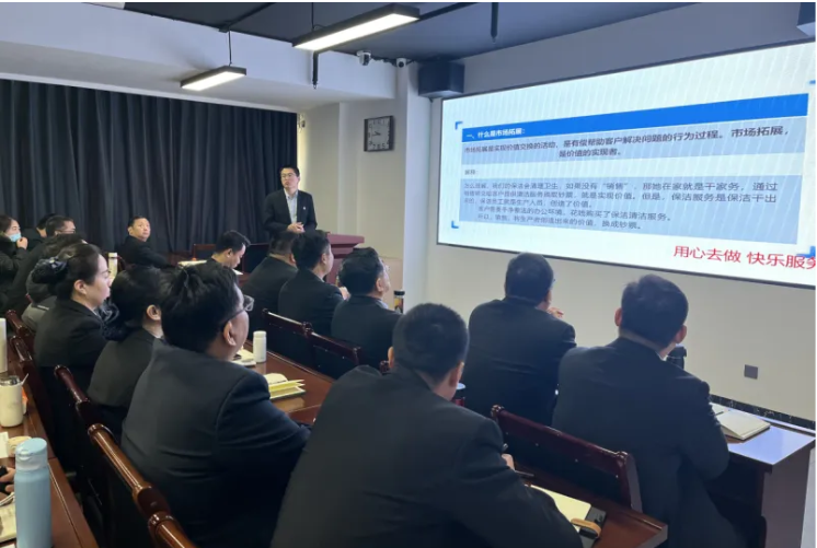 連心物業(yè)工會(huì)主席李寶建以“篤行致遠(yuǎn),破局而立”為題展開(kāi)講解。他指出,要通過(guò)市場(chǎng)下沉策略,深入挖掘潛在客戶、打破行業(yè)壁壘,拓展業(yè)務(wù)邊界,利用存量項(xiàng)目打造區(qū)域名片,提升品牌影響力,同時(shí)成立市場(chǎng)團(tuán)隊(duì),集中資源進(jìn)行配合。他還強(qiáng)調(diào),要學(xué)習(xí)高效溝通技巧,提升情商,抓住主動(dòng)權(quán),主導(dǎo)談判,并運(yùn)用語(yǔ)言藝術(shù)吸引對(duì)方,以實(shí)現(xiàn)推銷公司和自我的目標(biāo)。