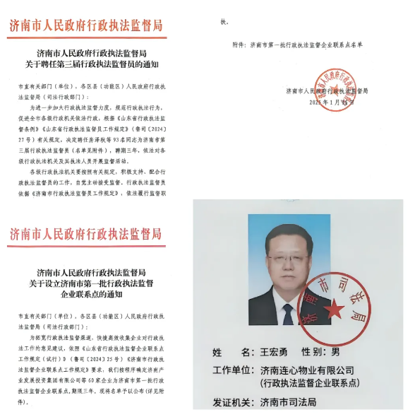2025年1月15日,濟(jì)南市人民政府行政執(zhí)法監(jiān)督局印發(fā)《濟(jì)南市人民政府行政執(zhí)法監(jiān)督局關(guān)于設(shè)立濟(jì)南市第一批行政執(zhí)法監(jiān)督企 業(yè)聯(lián)系點(diǎn)的通知》、《濟(jì)南市人民政府行政執(zhí)法監(jiān)督局關(guān)于聘任第三屆行政執(zhí)法監(jiān)督員的通知》,濟(jì)南連心物業(yè)有限公司被確定為“第一批行政執(zhí)法監(jiān)督企業(yè)聯(lián)系點(diǎn)”之一,濟(jì)南連心物業(yè)有限公司黨支部書記、董事長(zhǎng)王宏勇被聘任為“第三屆行政執(zhí)法監(jiān)督員”。