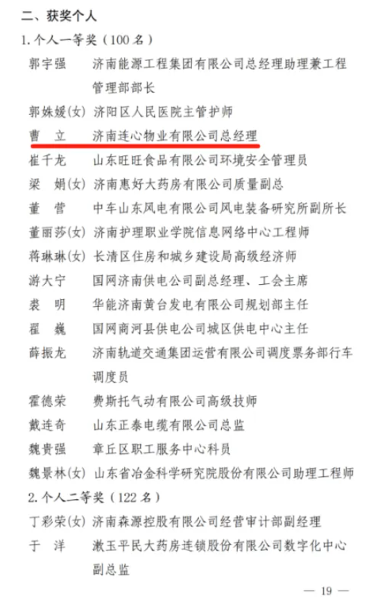 2025年4月30日,濟(jì)南市總工會(huì)發(fā)布《關(guān)于公布 2024 年“項(xiàng)目深化年”創(chuàng)新創(chuàng)優(yōu)勞動(dòng)競(jìng)賽結(jié)果的通知》,濟(jì)南連心物業(yè)有限公司榮獲創(chuàng)新創(chuàng)優(yōu)單位二等獎(jiǎng),黨支部副書記、總經(jīng)理曹立榮獲個(gè)人一等獎(jiǎng)。