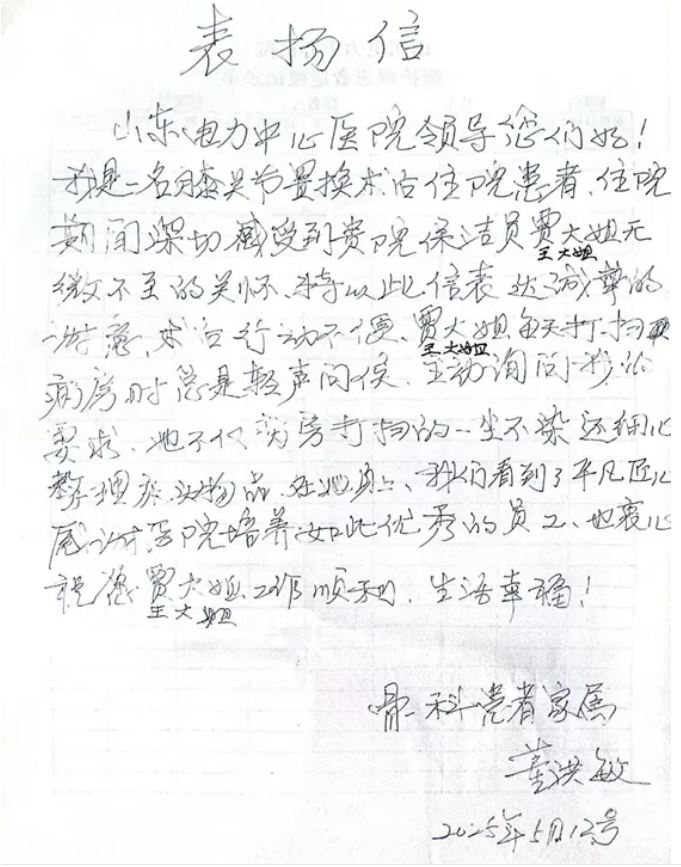 董老師的家屬在山東電力中心醫(yī)院骨科住院期間,物業(yè)保潔員賈士玲、王傳靜給予患者無微不至的關(guān)懷,術(shù)后行動不便,主動詢問患者需求、并且認(rèn)真清理病房衛(wèi)生,特以此信表達謝意。賈士玲、王傳靜對患者貼心服務(wù)讓病號感受到電力醫(yī)院就診時的溫暖與關(guān)懷。
