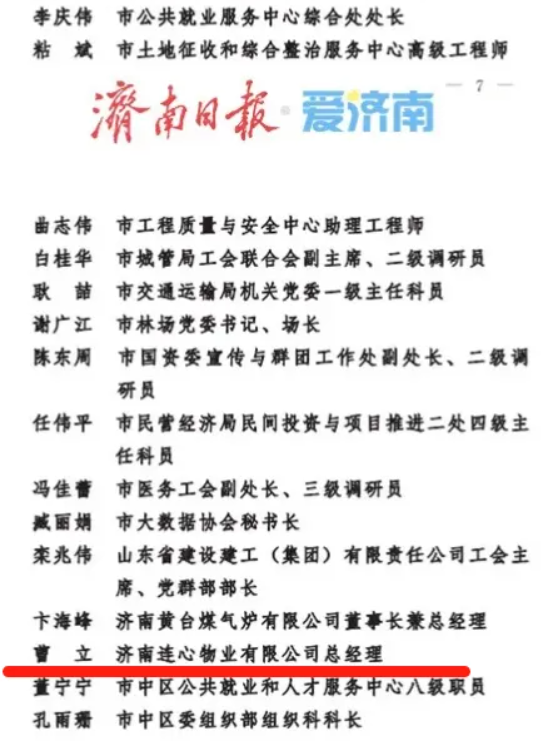 4月30日,中共濟(jì)南市委 濟(jì)南市人民政府發(fā)布《關(guān)于表揚(yáng)濟(jì)南市產(chǎn)業(yè)工人隊(duì)伍建設(shè)改革工作表現(xiàn)突出集體和個(gè)人的通報(bào)》。濟(jì)南連心物業(yè)有限公司黨支部副書記、總經(jīng)理曹立榮獲產(chǎn)業(yè)工人隊(duì)伍建設(shè)改革工作“表現(xiàn)突出個(gè)人”榮譽(yù)稱號(hào)。