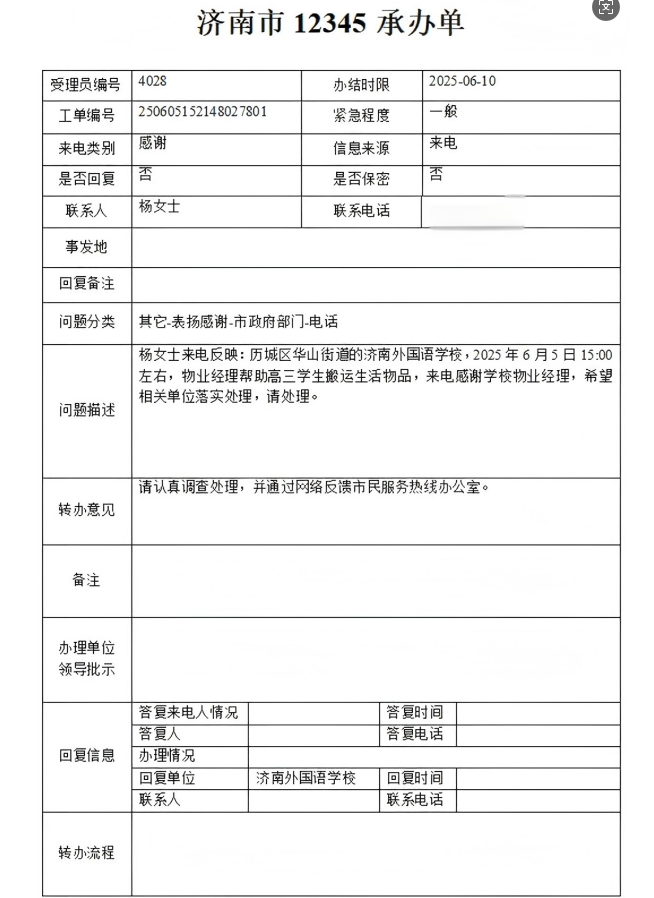 2025年6月5日,濟南連心物業(yè)有限公司駐濟南外國語學校項目收到12345表揚電話,市民楊女士通過12345市民熱線,對濟南連心物業(yè)公司駐濟南外國語學校項目物業(yè)經(jīng)理王金勇表達誠摯的感謝。
