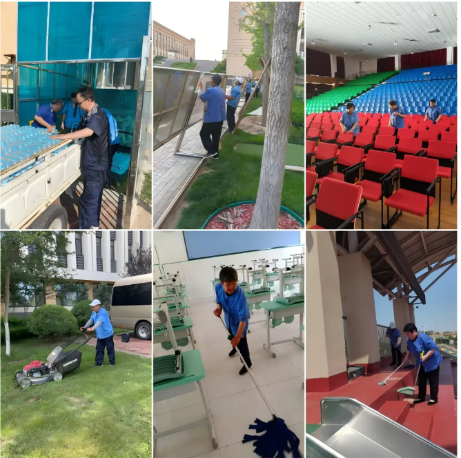 開(kāi)放日前,連心物業(yè)保潔團(tuán)隊(duì)對(duì)校園環(huán)境進(jìn)行全面深度清潔。從教學(xué)樓的教室、走廊,到圖書(shū)館、體育館等各個(gè)功能區(qū)域,乃至校園道路、操場(chǎng)等室外場(chǎng)所,都進(jìn)行細(xì)致入微的清掃,確保校園每一處都干凈整潔。綠化團(tuán)隊(duì)對(duì)校園內(nèi)的綠植進(jìn)行精心養(yǎng)護(hù),修剪枝葉、澆水施肥,讓校園綠意盎然,為參觀(guān)者營(yíng)造出優(yōu)美舒適的環(huán)境。維修團(tuán)隊(duì)也提前對(duì)校園內(nèi)的各項(xiàng)設(shè)施設(shè)備進(jìn)行全方位檢查與維護(hù)。對(duì)教學(xué)樓、場(chǎng)館的照明系統(tǒng)、電力設(shè)備、空調(diào)設(shè)施等逐一排查,及時(shí)修復(fù)發(fā)現(xiàn)的問(wèn)題,保障開(kāi)放日期間設(shè)施設(shè)備的正常運(yùn)行。另外進(jìn)行展板擺放、桌椅布置,物質(zhì)補(bǔ)給等保障工作,為各項(xiàng)展示和講解活動(dòng)提供穩(wěn)定支持。會(huì)服人員熱情周到地接待每一位來(lái)訪(fǎng)的學(xué)生和家長(zhǎng),為他們提供引導(dǎo)服務(wù),解答各種疑問(wèn),確保參觀(guān)者能夠順利有序地參與活動(dòng)。