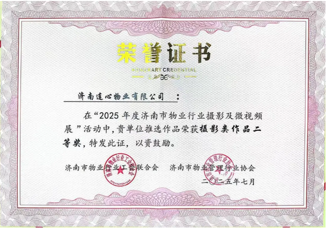 2025年7月23日,濟(jì)南市物業(yè)行業(yè)2025年度工會(huì)干部培訓(xùn)班暨攝影微視頻展表揚(yáng)活動(dòng)在博鰲大廈舉行。濟(jì)南連心物業(yè)有限公司攝影作品《城市溫暖的傳遞》榮獲二等獎(jiǎng)。