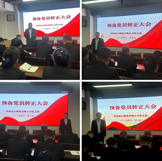 2025年11月10日下午,濟南連心物業(yè)有限公司黨支部在1701會議室召開第四季度黨員大會,公司全體黨員、入黨積極分子及遞交入黨申請書人員48人參加本次大會。學習黨的二十屆四中全會精神、審議預備黨員轉正事宜等兩項議程。