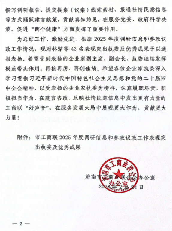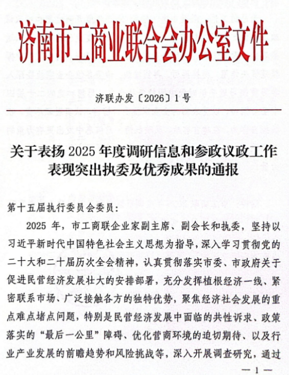 2024年2月24日,濟南市工商聯(lián)頒布“2025年度調(diào)研信息和參政議政工作表現(xiàn)突出執(zhí)委及優(yōu)秀成果”,濟南連心物業(yè)有限公司董事長王宏勇等43名執(zhí)委獲評表現(xiàn)突出執(zhí)委,他撰寫的《關(guān)于加快AI時代我市物業(yè)企業(yè)智慧化轉(zhuǎn)型的建議》獲評優(yōu)秀成果。