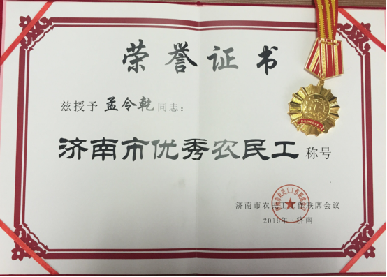 濟(jì)南連心物業(yè)有限公司孟令乾同志獲得“優(yōu)秀農(nóng)民工”稱號