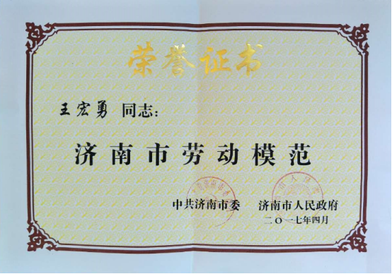 --王宏勇同志榮獲“濟(jì)南市勞動模范”榮譽稱號