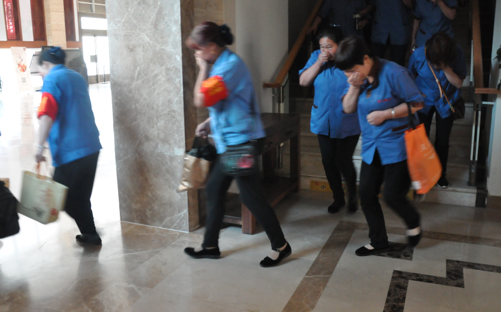 14:43分伴隨著總指揮的一聲令下,消防演習(xí)正式拉開了帷幕。位于四樓走廊垃圾桶內(nèi)煙頭未滅突然起大火,情況危急,消控人員發(fā)現(xiàn)火情立即報(bào)告總指揮啟動(dòng)滅火疏散應(yīng)急預(yù)案,同時(shí)啟動(dòng)消防廣播播報(bào)消防疏散通知。在總指揮的指揮下,滅火行動(dòng)組、疏散警戒組、通訊聯(lián)絡(luò)組同時(shí)展開行動(dòng):滅火行動(dòng)組迅速趕赴火災(zāi)現(xiàn)場(chǎng)拿取就近的消防器材進(jìn)行滅火;疏散警戒組迅速引領(lǐng)各樓層人員從安全通道撤離到廣場(chǎng)處安全地帶;通信聯(lián)絡(luò)組則在疏散同時(shí)將現(xiàn)場(chǎng)情況及時(shí)反饋給總指揮。整個(gè)滅火疏散演練過(guò)程有序、緊湊、高效,所有人員有序撤離到廣場(chǎng)安全地點(diǎn)清點(diǎn)人數(shù),此項(xiàng)演練總用時(shí)2分07’。