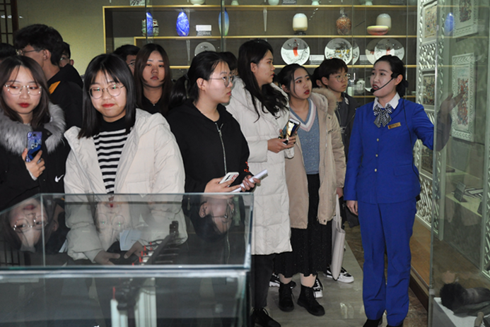 連心物業(yè)金牌講解員賈寧在非物質(zhì)文化遺產(chǎn)精品展廳為同學(xué)們做專業(yè)講解