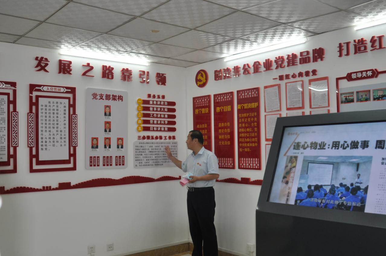 活動第三項,所有參會人員一同參觀公司在山東省文化館設(shè)立的黨員活動室,黨支部委員吳建軍對黨員活動室中的公司黨支部架構(gòu)、黨員榮譽、先優(yōu)表彰、“三必訪五必談工作法”等章節(jié)進行現(xiàn)場解讀;黨小組長李寶建結(jié)合公司的“企業(yè)宣傳片”、“先優(yōu)表彰大會”等視頻資料向大家介紹了我們身邊涌現(xiàn)出的先進個人及先進事跡,通過真實的案例感染了在場所有人員,增強了大家的歸屬感和榮譽感。