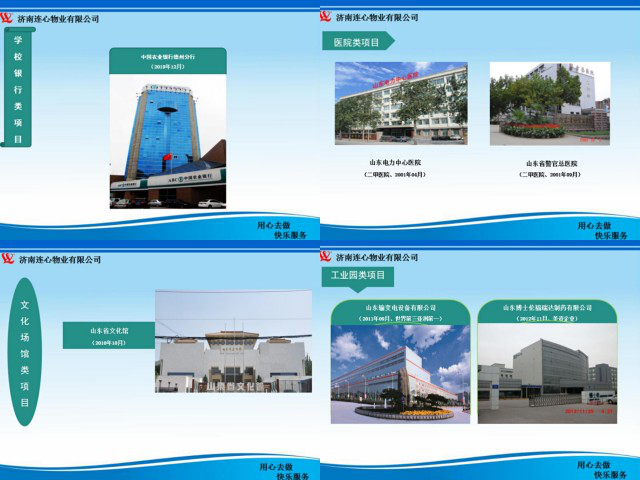 在公司宣傳冊(cè)上,清晰地印記著40多家現(xiàn)代醫(yī)院、工廠(chǎng)、銀行、學(xué)校、大型商場(chǎng)綜合體、高檔辦公寫(xiě)字樓、住宅、公寓、影城、公眾場(chǎng)館等物業(yè)服務(wù)托管的時(shí)間,也記錄著公司業(yè)務(wù)不斷擴(kuò)大、企業(yè)規(guī)模一天天見(jiàn)長(zhǎng)的歷程,這就好似一個(gè)個(gè)孩子的出生證明,方方正正擺放在那里,任憑你查證。