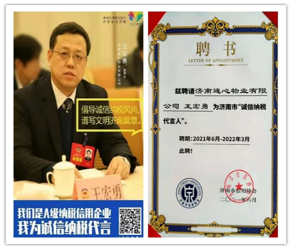2021年6月25日,市信用協(xié)會、全國“信易貸”平臺濟(jì)南運(yùn)營中心聯(lián)合舉辦誠信納稅代言人聘任儀式暨“信用濟(jì)南·誠信納稅“主題宣講會。本次大會為濟(jì)南連心物業(yè)有限公司董事長王宏勇等20位被評為“誠信納稅代言人”的人員頒發(fā)聘書并合影。