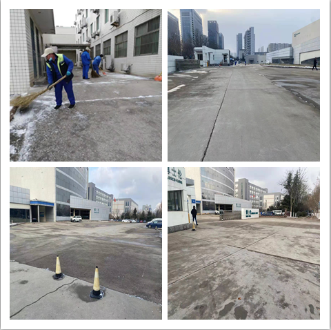 24日約凌晨5點(diǎn),地上開(kāi)始由明顯積雪,秩序維護(hù)夜班人員開(kāi)始對(duì)大門(mén)口和門(mén)口通往辦公樓、車間、車棚進(jìn)行除雪。7點(diǎn)整,山東博士倫福瑞達(dá)項(xiàng)目全體人員到崗,按照各自分工進(jìn)行除雪。秩序維護(hù)夜班主動(dòng)晚下班一小時(shí),配合白班對(duì)大門(mén)口及進(jìn)門(mén)后東西兩側(cè)除雪,樓層保潔對(duì)進(jìn)樓臺(tái)階進(jìn)行清理,并鋪好防滑墊,外圍分成2組,一組對(duì)廠區(qū)主干道警醒清理,一組開(kāi)始撒鹽水化雪。