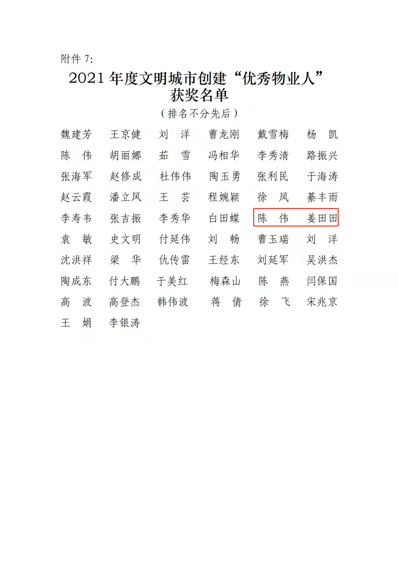 2022年1月,濟(jì)南市市中區(qū)住房和城鄉(xiāng)建設(shè)局表彰了連心物業(yè)陳偉、姜田田在內(nèi)的56名“2021年度優(yōu)秀物業(yè)人”。在2021年全區(qū)文明城市創(chuàng)建、疫情防控、“泉城紅色物業(yè)”工作推進(jìn)以來,在公司總部的領(lǐng)導(dǎo)下,兩名同志緊緊圍繞各項(xiàng)指標(biāo)要求,組織有力、成績突出、勇挑重?fù)?dān)、甘于奉獻(xiàn),全身心投入到各項(xiàng)工作中,在平凡的崗位上做出了不平凡的業(yè)績。