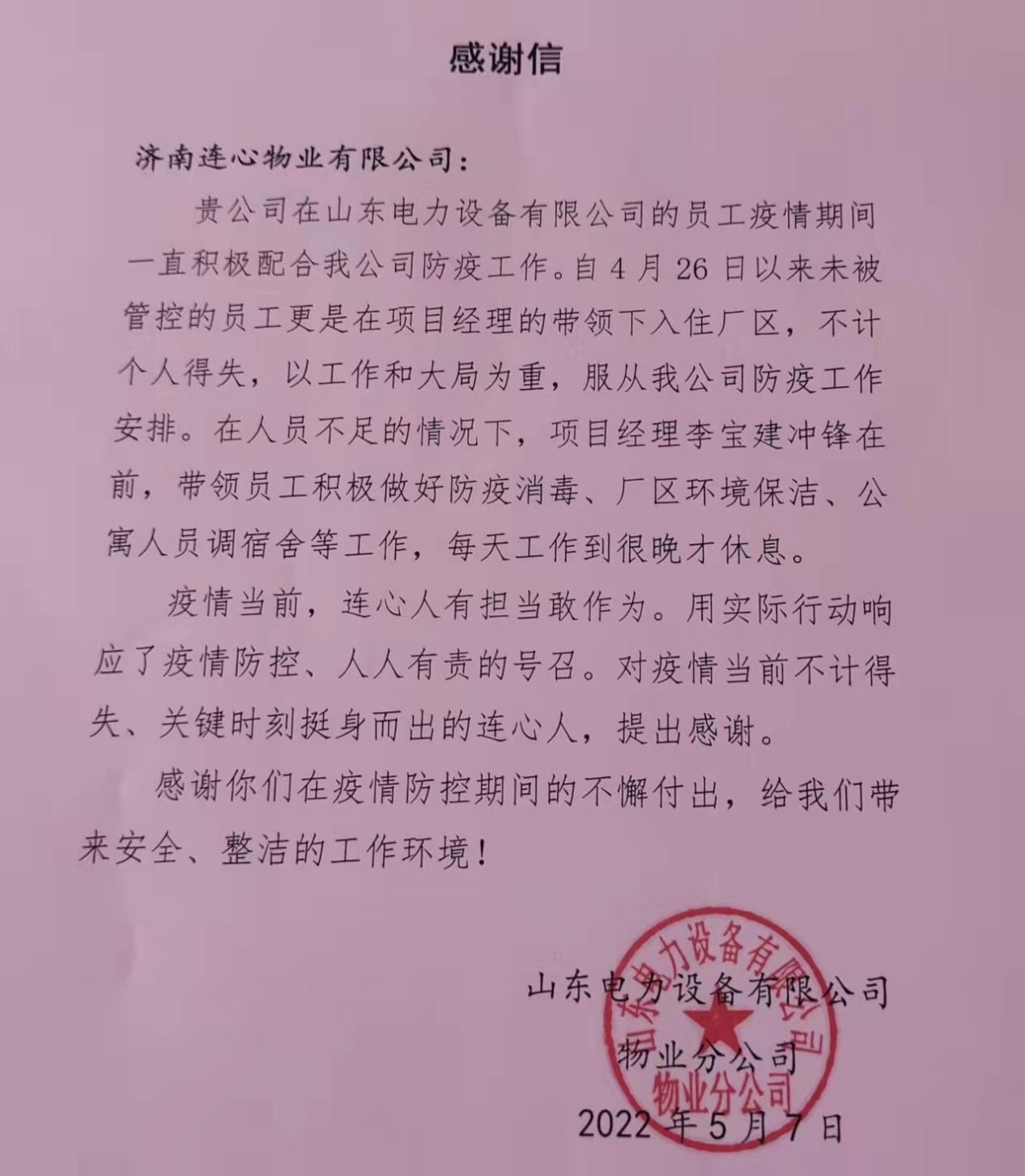 2022年5月7日,公司駐山東電力設(shè)備有限公司項(xiàng)目部收到甲方的表揚(yáng)信一封,對項(xiàng)目部員工在疫情期間的工作給予肯定和表揚(yáng)。自26日晚入住廠區(qū)以來,留廠員工在項(xiàng)目經(jīng)理的帶領(lǐng)下24小時(shí)值守廠區(qū),在人員不足的情況下,大家加班加點(diǎn)忙現(xiàn)場,在消毒防疫、設(shè)施維修、環(huán)境保潔、宿舍調(diào)換、食堂盒飯領(lǐng)取送達(dá)等方面給予了大力的配合和支持,每天忙到很晚才休息。對以大局為重不計(jì)個(gè)人得失的連心人,提出表揚(yáng)!