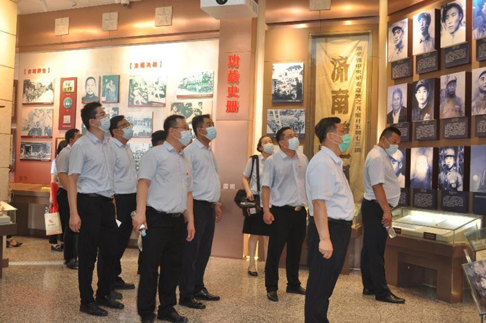 隨后全體黨員赴濟(jì)南解放閣--濟(jì)南戰(zhàn)役紀(jì)念館參觀學(xué)習(xí)。大家登上解放閣,陳毅題寫的“解放閣”和遲浩田題寫的“濟(jì)南解放紀(jì)念館”牌匾格外醒目。紀(jì)念館內(nèi),大量的文物和照片資料,生動(dòng)地展現(xiàn)了濟(jì)南戰(zhàn)役的歷史場景。同志們仔細(xì)觀看了歷史圖片、烈士遺物、濟(jì)南戰(zhàn)役模型,聆聽了革命先烈的英勇斗爭事跡。在濟(jì)南戰(zhàn)役英雄群像前,在一件件珍貴的歷史文物前,在一個(gè)個(gè)英烈的姓名前,大家不時(shí)駐足凝望。