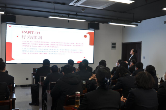 新年伊始,濟(jì)南連心物業(yè)有限公司于2023年1月27日在公司1701會(huì)議室舉行開工前首次集中培訓(xùn)。公司黨支部書記、董事長(zhǎng)王宏勇、副董事長(zhǎng)兼產(chǎn)發(fā)連心物業(yè)總經(jīng)理戚圣輝,公司黨支部副書記、總經(jīng)理孟令乾、副總經(jīng)理曹立、工會(huì)主席李寶建、總經(jīng)理助理李義及公司二級(jí)主管以上46名管理人員一同參加此次集中培訓(xùn)學(xué)習(xí)。
