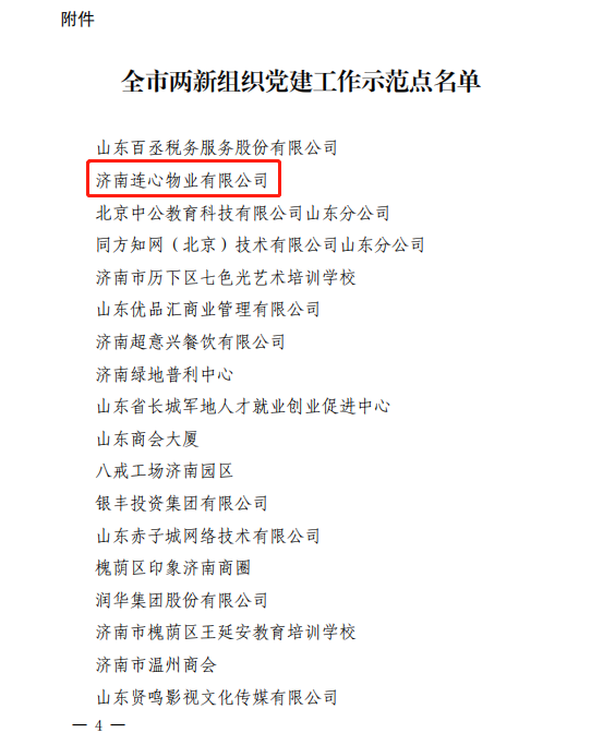 近日,中共濟南市委非公有制經(jīng)濟組織和社會組織工作委員會公布了“關(guān)于命名市級兩新組織黨建工作示范點的通知”,濟南連心物業(yè)有限公司被確定為“市級兩新組織黨建工作示范點”。