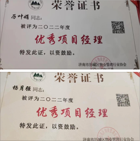 濟(jì)南連心物業(yè)有限公司榮獲“2022年度優(yōu)秀會長單位”、“2022年物業(yè)行業(yè)創(chuàng)新獎”、歷葉娟、楊月強(qiáng)獲“2022年度優(yōu)秀項目經(jīng)理”等榮譽(yù)稱號。