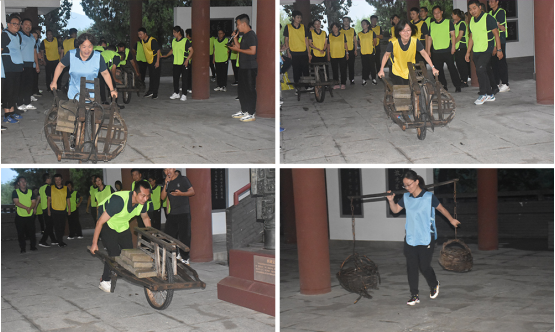 西柏坡紀(jì)念館參觀后,我們進(jìn)行了“溝通凝聚、熔煉團(tuán)隊(duì)”的拓展訓(xùn)練環(huán)節(jié)。首先以“破冰之旅”—“創(chuàng)建小組團(tuán)隊(duì)”、“團(tuán)隊(duì)展示”等拉開帷幕,接下來的團(tuán)建項(xiàng)目以“水果消消樂、獨(dú)輪車運(yùn)送軍糧、扁擔(dān)挑糧送戰(zhàn)場(chǎng)等拓展”為主題,進(jìn)行活動(dòng)名次爭(zhēng)奪。拓展活動(dòng)的各項(xiàng)任務(wù)完成需要隊(duì)友們分工協(xié)作、精誠團(tuán)結(jié),對(duì)于速度和質(zhì)量有很高的要求,同時(shí)體現(xiàn)了各隊(duì)相互之間的有效溝通和團(tuán)隊(duì)凝聚力。